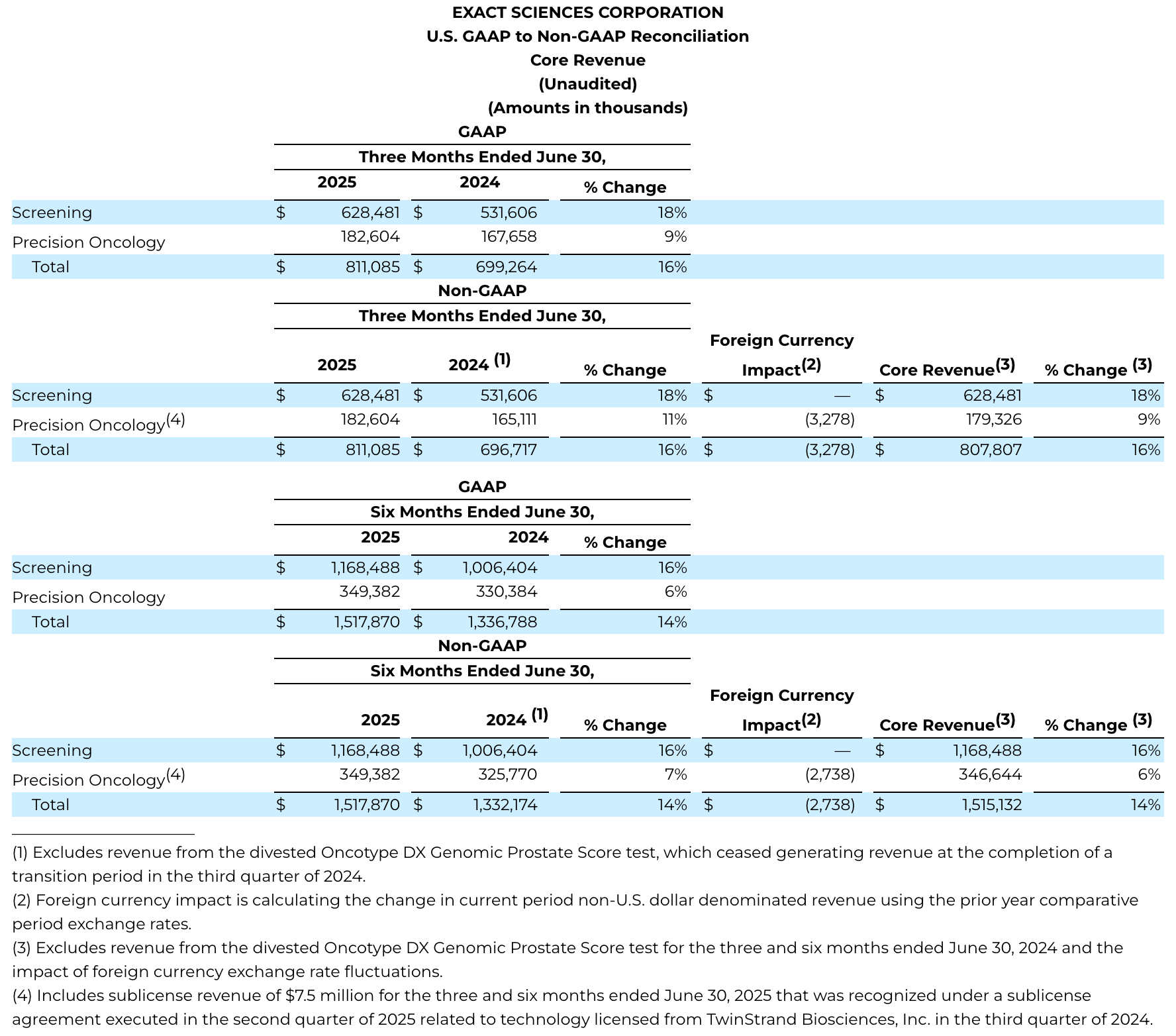 MADISON, Wis., August 6, 2025 -- Exact Sciences Corp. (Nasdaq: EXAS), a leading provider of cancer screening and diagnostic tests, today announced that the Company generated revenue of $811 million for the second quarter ended June 30, 2025, compared to $699 million for the same period of 2024.